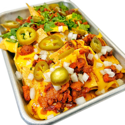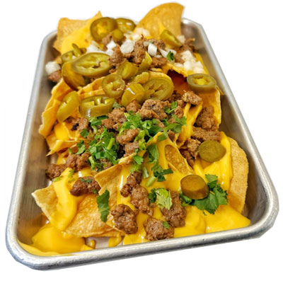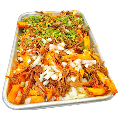 Birria fries savory birria piled on fries with melted cheese, smooth beans, diced onions, and fresh cilantro. flavor-packed in every bite.