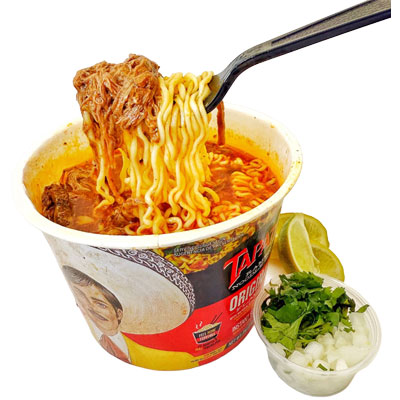Tender beef with ramen noodles and savory birria broth, topped with onions, cilantro, and lime. Perfect with a birria taco.